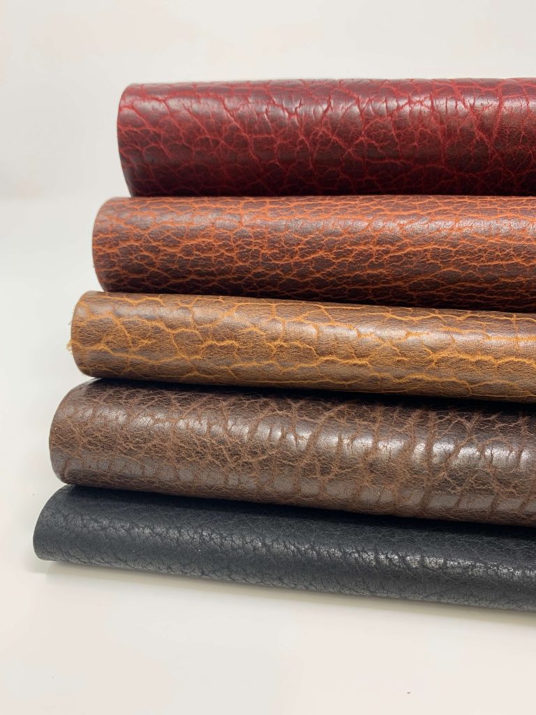 - Leather: 7-8oz oz shrunken-grain American bison, deep red